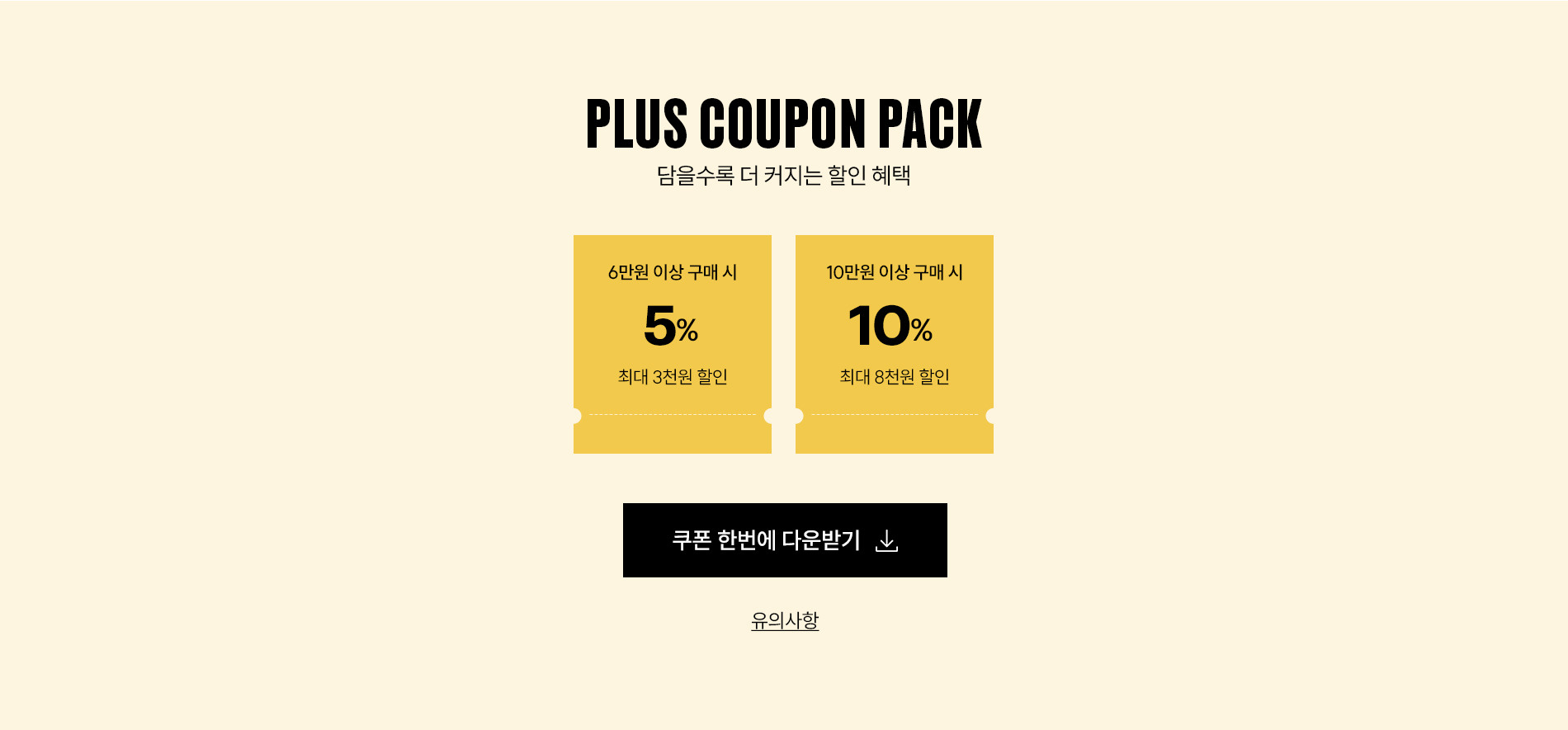 - 쿠폰 사용 조건 : 6만원 이상 구매 시 5% 쿠폰 (최대 3,000원 할인) 10만원 이상 구매 시 10% 쿠폰 (최대 8,000원 할인)